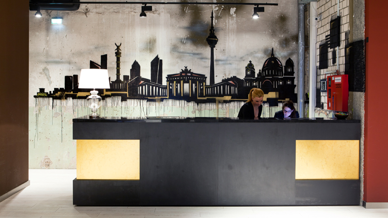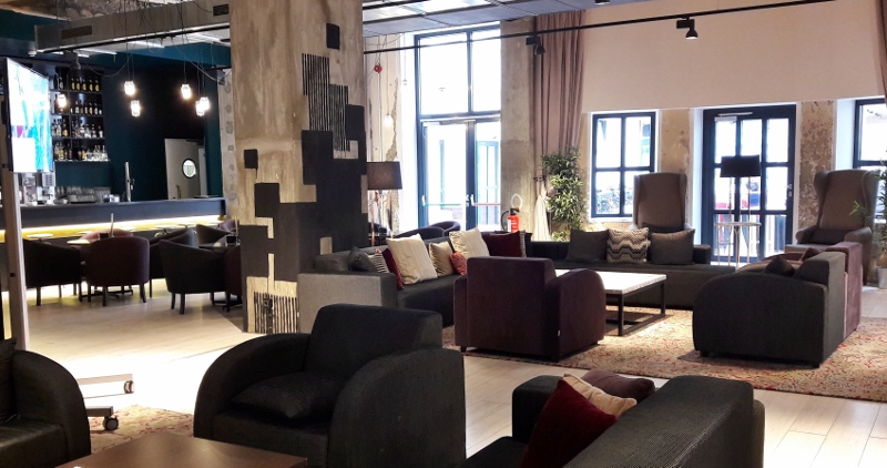 Die Innenausstattung ist eine Mischung aus Berliner Industrie-Charme und lässigem Barcelona-Design. Welch gelungene Kombination! Großzügige Platzverhältnisse nicht nur in der Lobby und der Bar mit Frühstücksbereich – sondern auch in den Zimmern …
