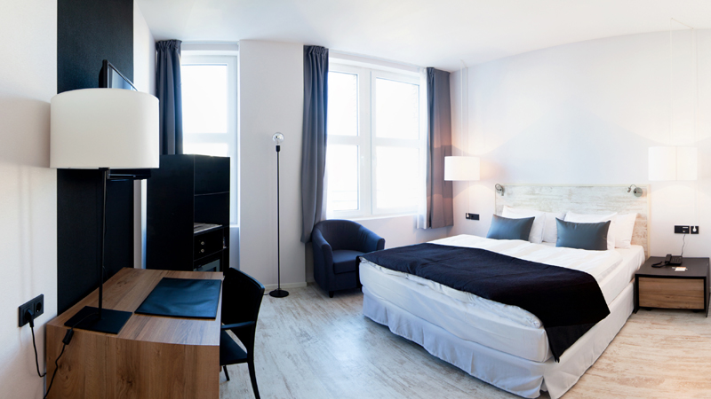 Genügend Platz zum Arbeiten sowie ausreichend Stauraum für Kleidung und Co. Stylische Beleuchtung, ein blitzsauberes Bad und eine Minibar für den späten Durst. Hier kann man wunderbar Berlin-Eindrücke verdauen – oder in der Lobby neue Inspiration suchen …